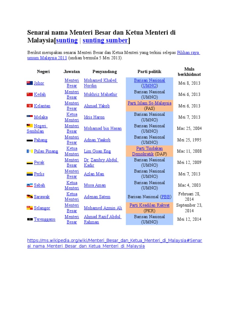 Senarai Nama Menteri Besar Dan Ketua Menteri Di Malaysia Pdf